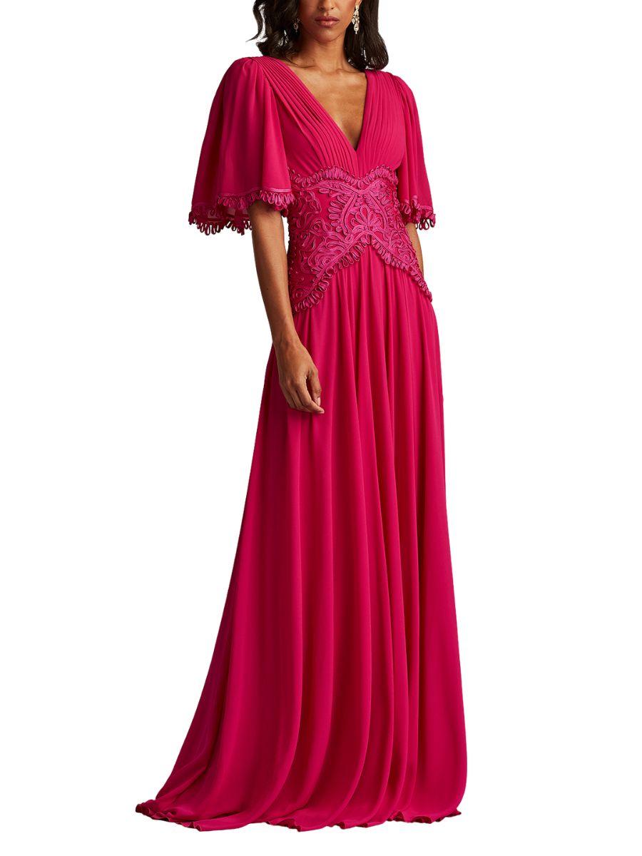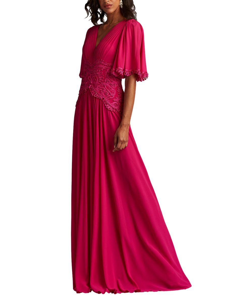 Descubre nuestro vestido largo bordado manga corta diseñado por Tadashi Shoji, una pieza que combina sofisticación y detalle artesanal. Con su escote en V envolvente, cintura realzada por delicado bordado soutache y mangas tipo campana, este vestido es la opción perfecta para eventos que merecen brillar. 💎