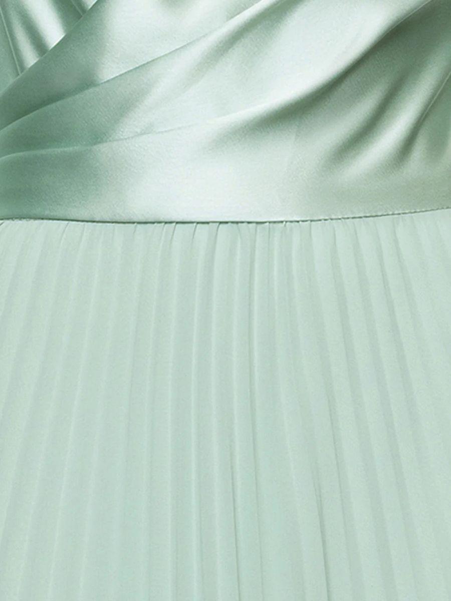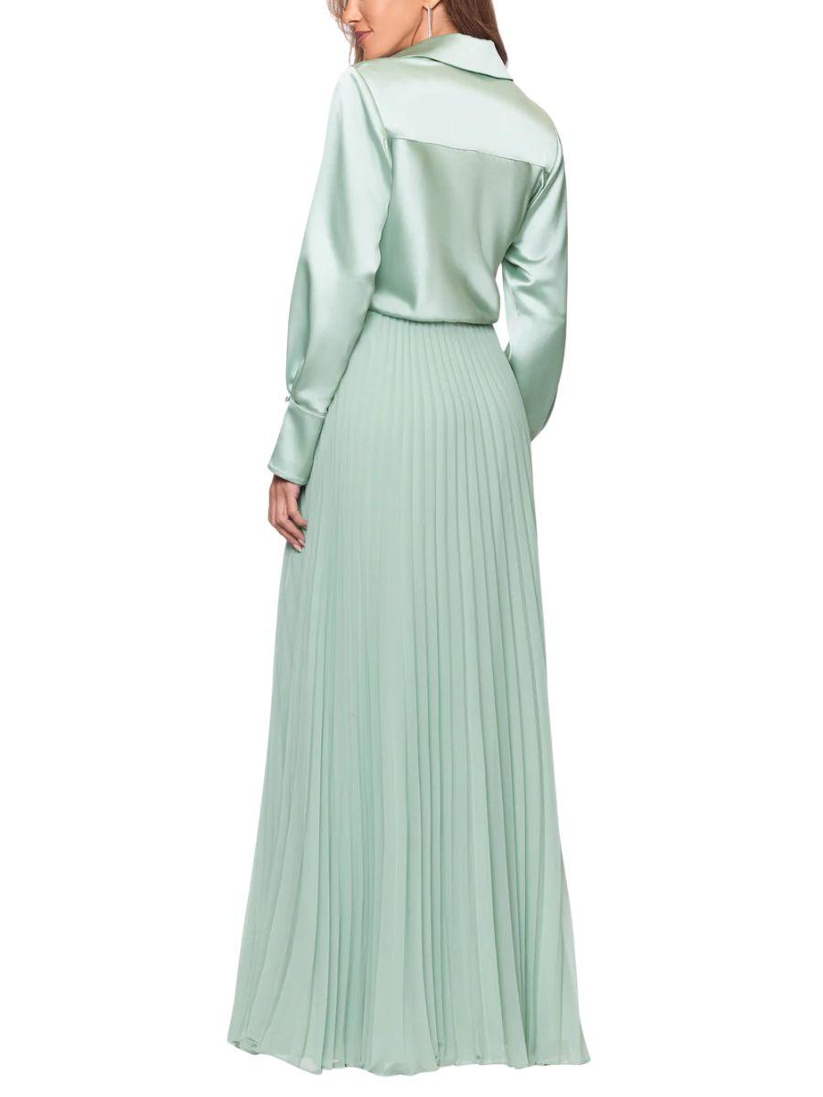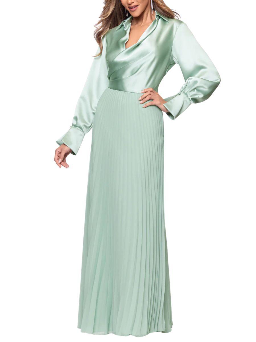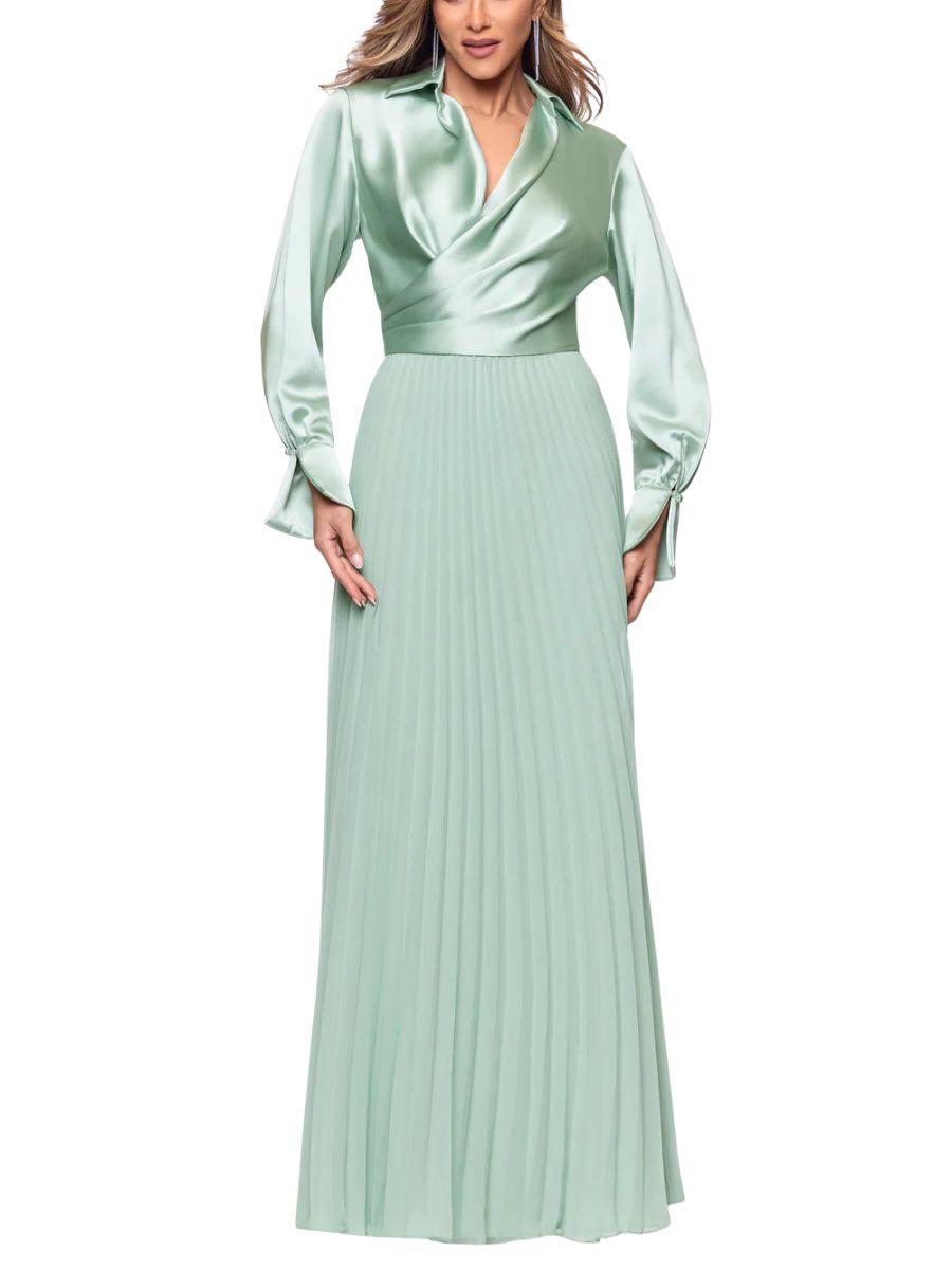 Nuestro vestido largo en satín de manga larga combina sofisticación y comodidad en una sola prenda. Con su cuello en V favorecedor, talle estructurado en satín y falda de gasa plisada en un delicado tono menta, este diseño es perfecto para cualquier ocasión especial. 💎